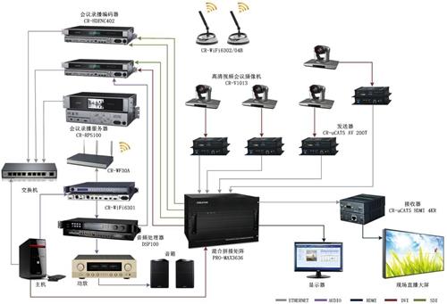 现场两台双路高清会议录播编码器出色完成音视频信号的采集及处理工作,独特的音视频处理技术,完美实现去噪、转换、视频缩放、画中画、画外画及混音等场景处理,处理后的信息及时无损的传输至服务器。会议录播服务器CR-RPS100拥有2TB高容量监控级别硬盘,统一管理和控制音视频信号、计算机屏幕信号的同步录制、预览、直播、点播、下载等功能。