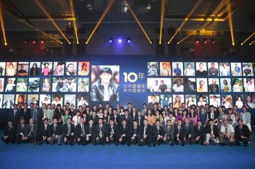 紧接着,小池社长上台致辞对各位利益相关方表达感谢,加藤董事长致辞表示了兄弟(中国)将不断挑战的决心。在尹总经理慷慨激昂的举杯祝酒之下,10周年的晚宴开始。当晚与兄弟(中国)合作满10年的代理商、供应商以及为服务公司超过10年的员工,都获得兄弟(中国)颁发的各类奖项。而在接近尾声之际,小池社长上台,为加藤董事长颁发十周年纪念品、为尹总经理颁发社长奖。社长奖是一年一度为了表彰Brother集团中取得突出成绩的公司的一项奖励制度。此次兄弟(中国) 从100多家分支机构中脱颖而出,在10周年之际取得社长奖。这不仅是集团给予兄弟(中国)的崇高荣誉,也是对于兄弟(中国)过去10年的肯定和对未来的鞭策。最后,尹总经理邀请兄弟(中国)全体管理职成员集体登台,致辞感谢这10年间各相关方包括来自于兄弟中国员工的辛勤付出、Brother集团总部大力支持、战略合作伙伴的鼎力相助、广大媒体朋友对于兄弟品牌影响力提升的努力。并带领全体管理职成员集体鞠躬致谢。在响彻会场的掌声中,兄弟(中国)的10周年庆典正式落下帷幕。
