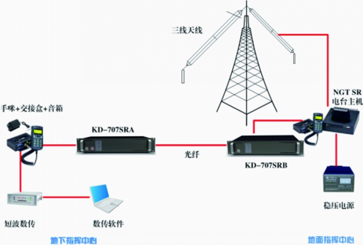 KD-707SR短波远程控制器是针对澳大利亚柯顿NGT SR短波电台的远程连接设备。主要是为了满足柯顿NGT SR短波电台应用中人机交互部分(手咪、音箱、交接盒等)与发射机及天线部分分离(中、远距离)使用的需求,解决主控室与发射台站不在同一地点、天线架设地点与主控室距离超过天线馈线规定的最大长度和紧急状态下保证主控室或指挥所人员安全等在实际使用过程中急需解决的问题而专门研制开发的。短波远程控制器设备连接简单,扩展功能丰富,系统可以通过自行敷设或者租用电信公司的光纤线路(单模单纤)将无线短波电台操控部分与发射台天线在最大100KM范围内进行远程连接。