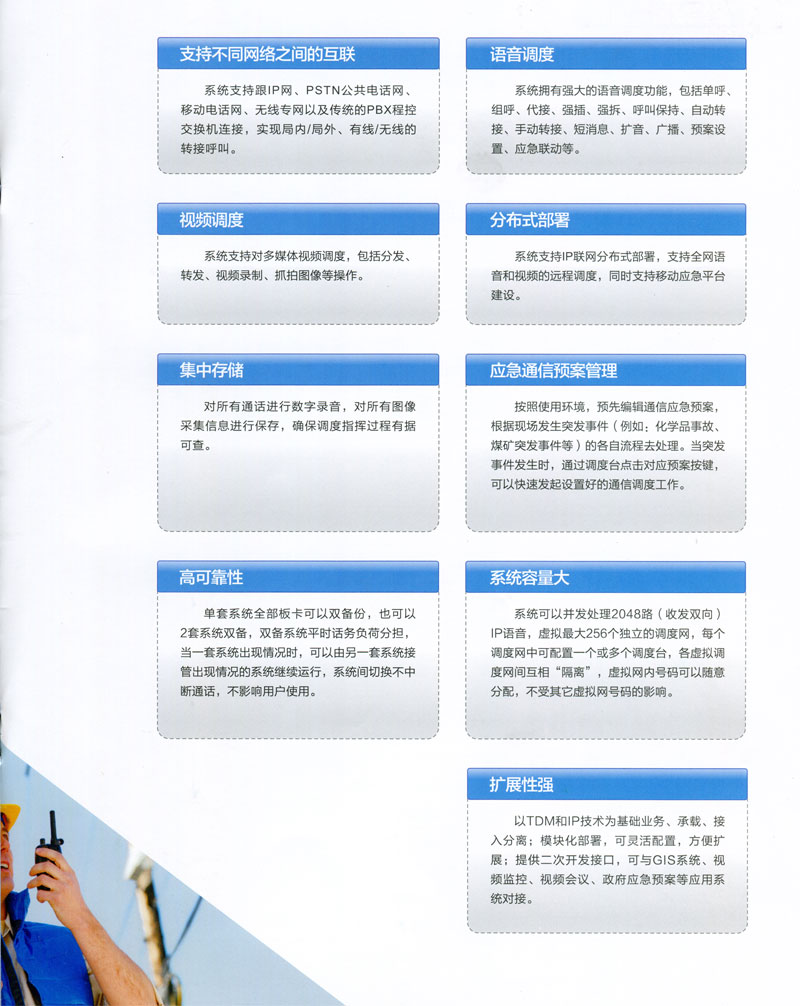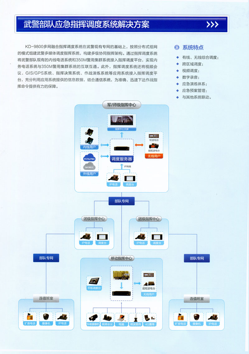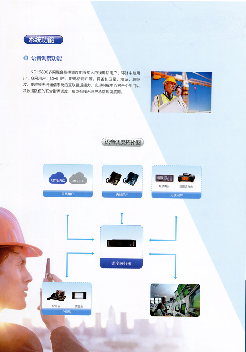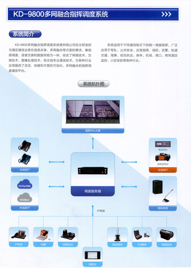 KD-9800多网融合指挥调度系统,应急指挥调度系统是柯顿通信科技有限公司根据业务的需求并与国内著名大专院校合作而开发、生产,为政府、税务、电力、军队、金融行业,以及大中型企业等提供的IP音视频通信设备,可以满足10000个内部用户的业务需求。提供基本语音业务、视频监控、视频会议、补充业务、智能业务和IP新业务。