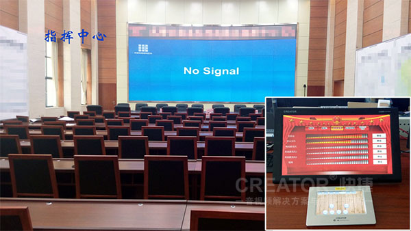 CREATOR快捷中央控制系统则实现了对现场所有声光电设备的集中控制,如矩阵切换器、现场摄像机、机顶盒、DVD、融合器、分割器、DLP大屏、音频处理器、桌面升降器、窗帘、警徽升降、机房空调、会议模式等。现场配备了21.5英寸有线画中画可编程触摸屏CR-G21HD及8英寸手持无线可编程触摸屏CR-WiFi WG7pip实现人机交互,实现对偌大指挥中心随时随地一键化控制。