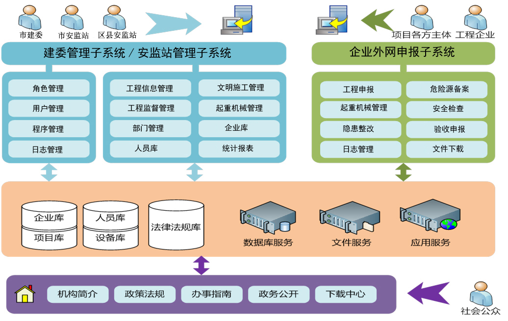 工程信息管理、工程监督管理、OA办公、公文流转、检测管理、外网申报、综合查询、报表管理、地理位置、外网网站、系统管理、第三方系统集成管理。