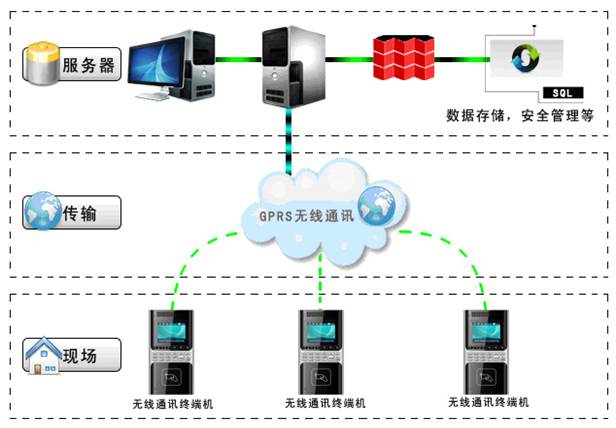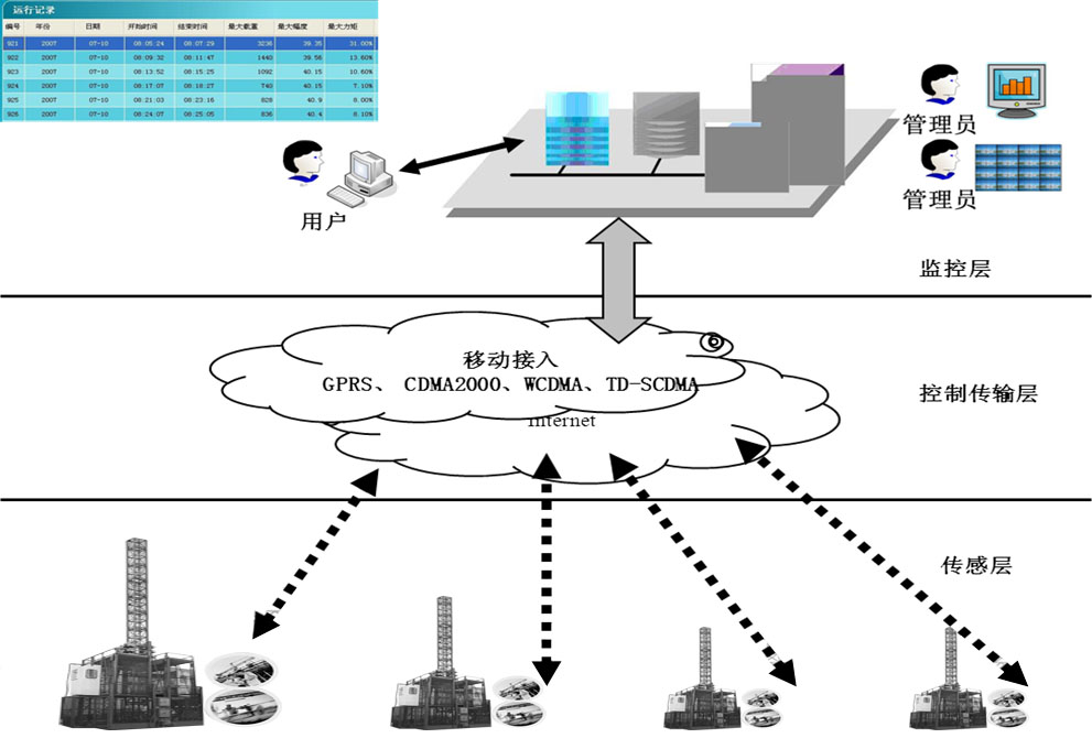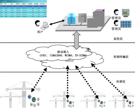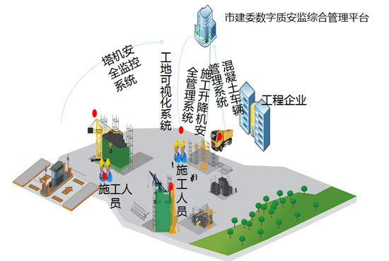 建设工程安全质量物联网管理系统,主要由信息采集层、网络接入层、网络传输层、信息存储与处理层组成。将移动执法终端、施工升降机、塔式起重机作业产生的动态情况、工地周围的视频数据、混凝土搅拌车超载超速信息及时上传给综合管理平台。