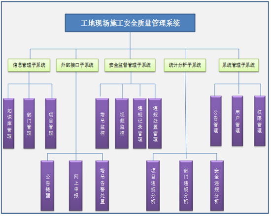 系统管理、项目管理、部门管理、安全质量知识库管理、公告提醒、危险源管理、人员管理、违规记录管理、塔吊监控管理、施工升降机监控管理、视频监控管理