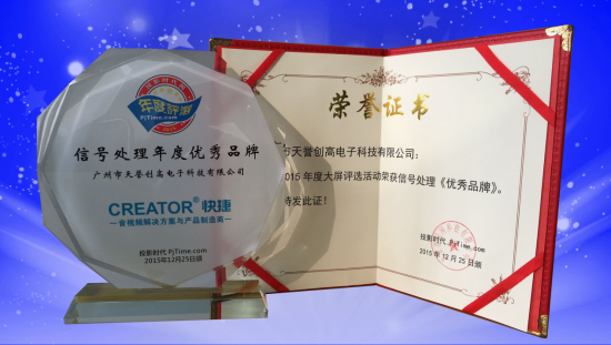 传递行业正能量,聚合中国大屏视听产业核心力量,2015年投影时代网大屏视听行业年度评选最终授予广州市天誉创高电子科技有限公司(品牌:CREATOR快捷)2015年度信号处理“优秀品牌”殊荣。