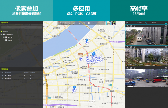 可视化实战平台体系,依托超高分辨率拼接大屏,可将有限物理分辨率大屏幕叠加组合成超高分辨率拼接电视墙,作为一个高分辨率、大面积的显示终端,显示超高分辨率的电子地图、视频监控、GPS设备、指挥调度业务系统等,其显示分辨率是单屏显示分辨率的叠加,图像显示内容更加丰富,范围更加广阔、图像更为清晰,避免需要频繁拖动鼠标才能看到不同区域的内容。