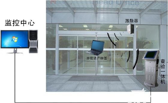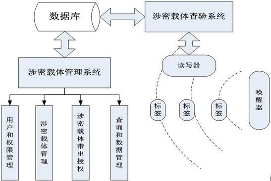 涉密信息载体上的RFID唤醒标签(低频125Khz+2.45GHz)平常处于休眠状态,不主动发射无线信号,当涉密信息载体经过门口检查区时,唤醒标签(低频125Khz+2.45GHz)被唤醒器唤醒,发送唤醒标签(低频125Khz+2.45GHz)的ID号和状态数据,实现带出载体的检查。