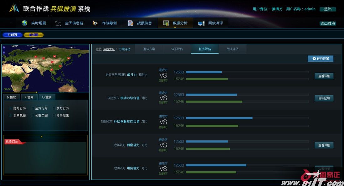 系统紧跟世界军事发展步伐,努力展现联合作战中复杂战场环境对作战行动的影响效果,以及作战行动越来越依赖保障行动的实际情况,把可能发生在战场上的各类自然环境、电磁环境和保障因素生成在模拟战场的地图上,并通过规则把这些要素与作战行动联系起来,最大限度还原战场真实情况。