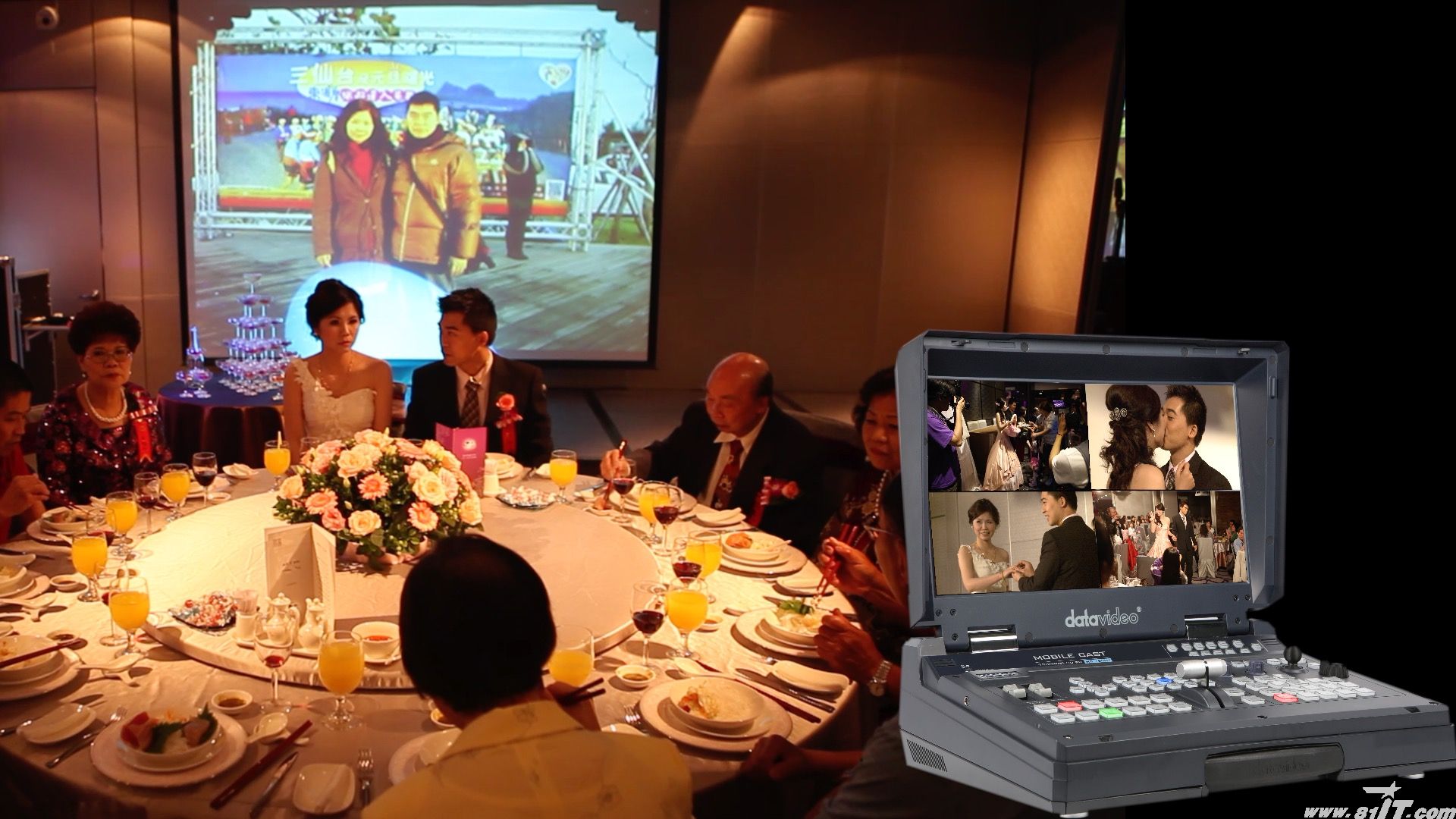 Datavideo为此提供了一套整体解决方案:HS-1500T HD/SD 4通道便携式移动演播室+PTC-150T HD/SD 云台摄像机。一般的婚纱摄像公司、制作公司或个人工作室等,在接到新人婚宴拍摄业务需求时,因为成本的考虑总会尽量避免使用多机位拍摄,但是此套HS-1500T + PTC-150T解决方案却提供了佳偶及拍摄者更多的发挥空间,并节省了许多不必要的开支。婚宴现场若以三机位布置,摄制团队无需动员大批人马,甚至少到只需要一人即可以胜任拍摄工作。