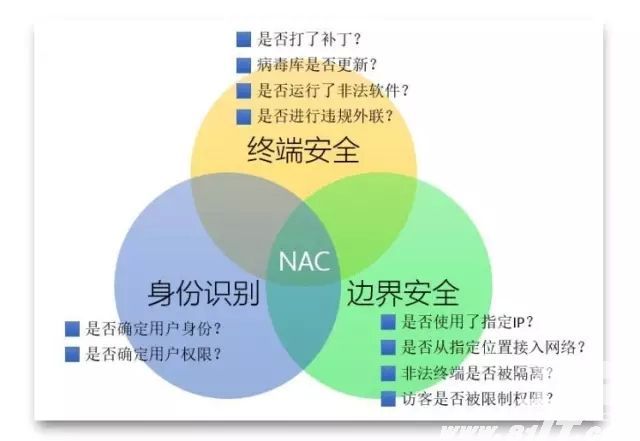 综合上面常见的网络问题,主要原因在于没有对网络边界进行管理,没有对网络接入进行控制,没有对使用终端的人进行定位,这正是网络接入控制 NAC(Network AccessControl)系统产生的基础。借助 NAC,客户可以只允许合法的、值得信任的端点设备(例如 PC、服务器、PDA)接入网络,而不允许其它设备接入。NAC 是终端安全、网络边界安全和用户身份识别的综合应用: