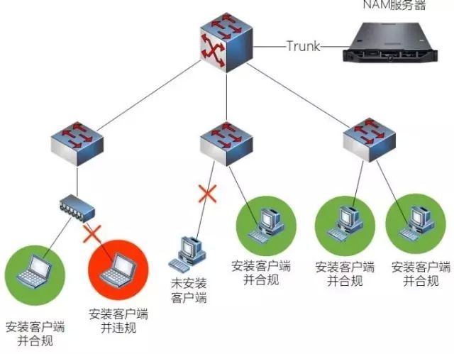 桌面安全主要是保护主机层面的安全,它侧重的是主机安全,而 NAM 是网络准入管理系统,侧重的是网络层面的安全接入,所以两者不但不冲突,还能相辅相成的工作。比如企业要求入网主机上必须安装了“杀毒软件 A”,如果安装了则能保证主机不受病毒攻击,但是很多人在没有安装此软件前提下将机器接入网络,或者私自将个人笔记本接入企业网络,从而增加了网络安全风险,如何保证只有企业内部的机器,并且安装了杀毒软件 A 后才能接入企业网呢?