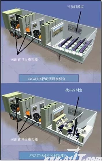 美空军AVCATT-A系统是典型的联合飞行训练模拟器。整个AVCATT-A物理布局由两部长53英尺(约15.2米)的拖车组成,共包括8个小房间,其中6个房间模拟显示直升机座舱、一个房间是控制中心,另一个房间是一个可容纳20人的行动回顾(AAR)室。