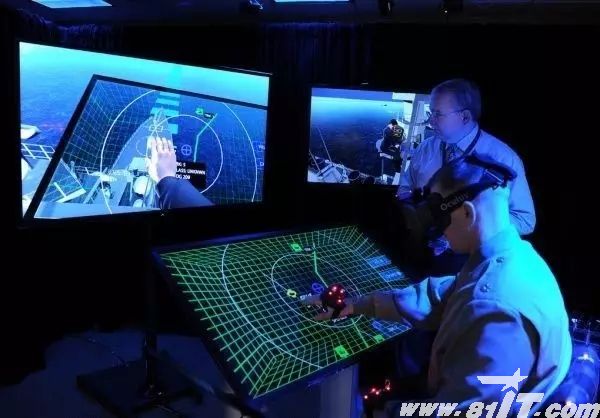 目前,美国海军使用的全玻璃化舰队指挥系统的指挥室内充满了各种各样的荧光屏,可以显示出己方作战力量的空间分布,以及最新的情报信息,但这还不算最先进的指挥系统,研究人员正在开发一种全息虚拟指挥控制系统,将在2025年参与作战。在这种全息虚拟指挥中心内,作战人员可以最大限度地利用战场信息,与周围的作战单元进行快速信息共享。通过触觉和视觉传感器完成对舰艇的控制,甚至可进行类似全息化的指挥操作。同时,通过配备耳机进行互动聊天和超视频的信息传递,让作战人员产生更加真实的感觉。图4中显示的是一位士兵正在虚拟的指挥中心操纵舰艇,通过佩戴视觉和触觉传感器对舰船进行控制。全息虚拟指挥系统的研究人员表示类似图中的控制技术将应用于未来的海军舰艇。