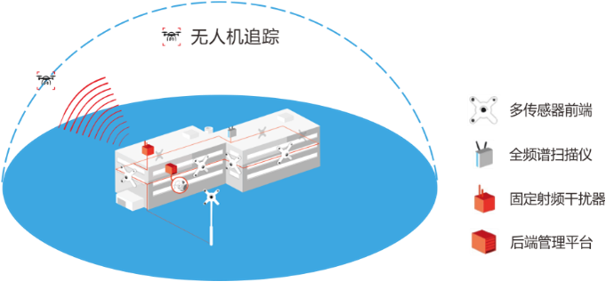 通过对低空域无人机“低”、“小”、“慢”等特性进行深度研究,将无人机防御系统分为前端探测设备、后端管理平台和射频抑制/干扰三大模块,同时具备 “自动辨识”“自动学习”等功能,达到快速探测、跟踪、干扰和反制入侵无人机。