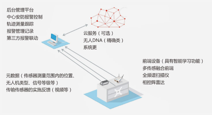 采用分布式结构。前端配置具有智能学习的探测设备,前端设备采集各种元数据,并实施部分即时反馈,后端管理平台负责对前端设备进行管理,并对数据进行进一步分析管理。系统可以通过云服务进行无人机数据库升级以及系统更新。