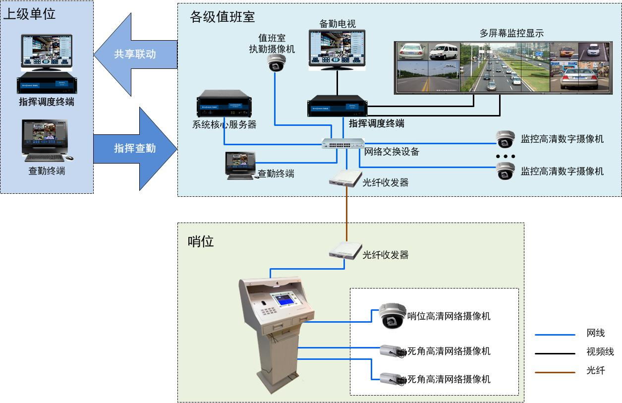 针对上述的使用不便的状况,哨位台的图像、报警及语音信息资源也将全面整合到一体化指挥管理信息平台内,通过整合哨位台的信息资源,将打破原本的哨位台只能到值班室的局限性,而将其作为一个重要的图像、语音和报警资源,整合到整个平台内,接入部署方式如下: