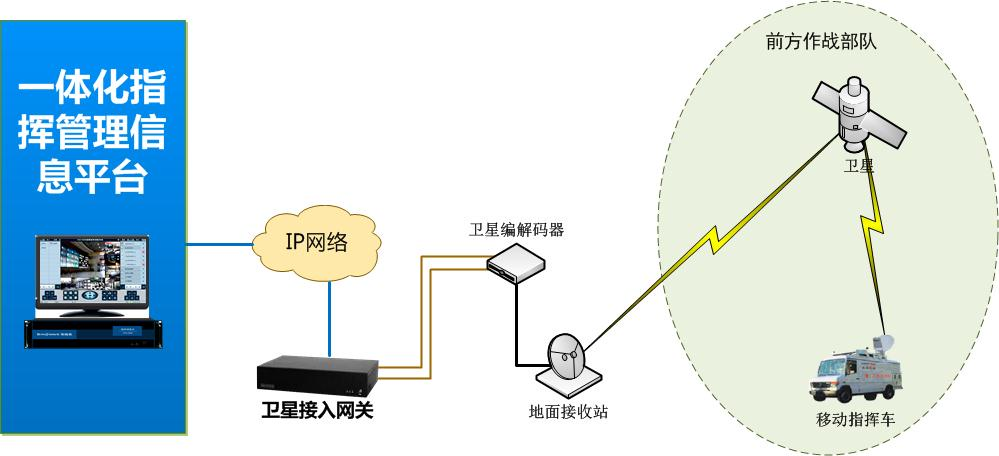 在本次的一体化指挥管理信息平台中,专门部署了卫星接入网关,对卫星图像和语音进行接入。接入方式如图所示:
