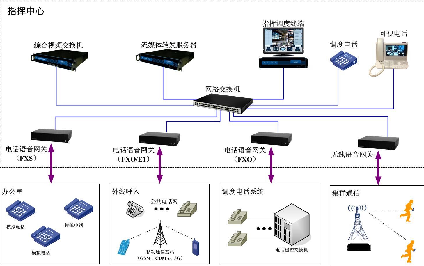 (3)与模拟程控电话系统进行互通:针对模拟程控电话系统,也将通过电话语音网关为实现与目前已建模拟程控电话系统进行呼叫互通,其将通过模拟环路中继接入当前已经部署的程控调度一体机,这样,平台中的指挥调度终端可通过其自带的拨号模块来拨号呼叫到电话系统中,同时,原已建电话系统中的有线电话、无线手机等,也可以拨号呼叫到指挥调度终端上,实现可视化指挥与电话系统的互通接入。
