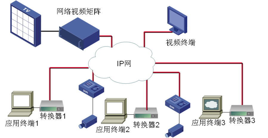 用户终端设备:包括管理控制软件、指挥终端、网络视频矩阵、网络视频矩阵控制软件、终端电话通话模块。主要作用是:实现终端双向音视频、VGA信号采集压缩编解码,提供用户业务交互和功能操作界面,实现音视频指挥管理、视频会议、远程视频浏览、数据会议,电视墙显示等功能。