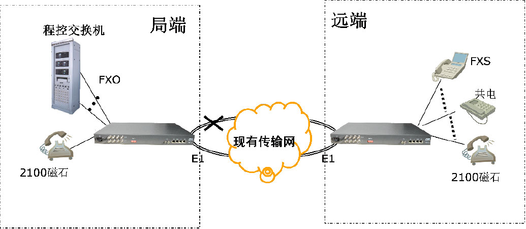 ◆提供30路电话FXO\FXS、磁石、2100HZ磁石、共电等通过E1传输