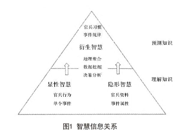 智慧营区之所以能够通过学习来不断掌握和提升,在于对显性智慧和隐性智慧的归纳与衍生。显性智慧作为最直接的智慧基础.通过对可以直接收集到的结构化数据知识。如特定人群(如司机班 群体、义务兵群体等)行为、日常或突发事件等,进 行分析处理和形态展现。为使用者提供服务.这也 是传统数据处理技术的智慧来源:隐性智慧则是显 性信息的属性.如某个特定人群的背景资料、某个事件的属性信息等.既不能通过视觉发现但可以通过数据库链接的属性信息:而衍生智慧是通过数据挖掘等技术对显性数据进行进一步的使用.如通过 对数据的分析和属性数据的比对得出某个官兵一段时间的行为习惯、日常或突发事件的规律等:这些智慧信息会影响到官兵的选择方式和管理者的决策方向.是传统分析手段未涉猎的领域如图1所示。