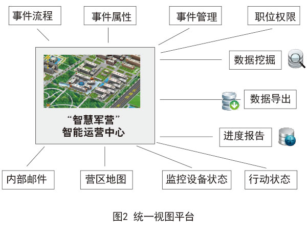 “智慧营区”智能运营中心提供了一个集中的实时协作环境,跨职能、组织监控和分享信息。每个部门的数据都可以在GIS平台上通过地图或三维地形为背景的视图中统一呈现,如图2所示。