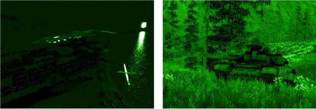 UNIGINE可在联合作战和战场环境等仿真中,添加图像增强、激光、红外线、热感应等传感器和扫描、多光谱、超光谱等军用光电的视觉成像仿真效果。这些效果可以被应用到飞行部队的夜视镜效果、地面部队的观察仪、瞄准具、驾驶仪、夜视眼镜、和微光电视中,海军部队的近战武器系统的仿真模拟。丰富了军事仿真内容,为监视、侦察、跟踪的仿真训练提高沉浸度和构想度。