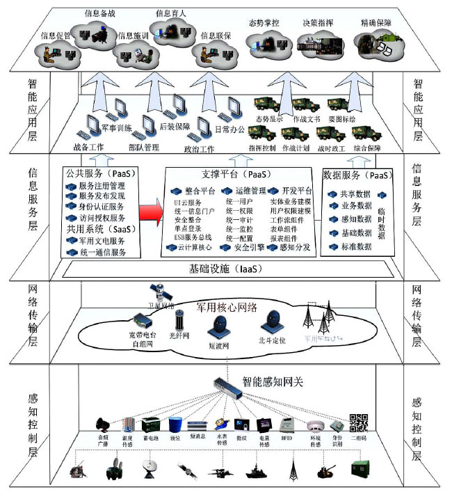 综合利用射频感应、全球定位、红外传感、生物特征识别等感知、捕获、测量技术随时随地对目标对象进行信息采集和获取。感知层重点解决信息获取问题,具有全面感知的核心能力,能够使原有网络信息节点延伸扩展到各类军事实体和末端用户,扩大了通信的对象范围,是智慧军营建设的基础。感知层综合了传感器、嵌入式计算、智能组网、无线通信、分布式信息处理等技术,能够通过各类集成化的微型传感器的协作,实时采集各种环境或监测对象的信息。