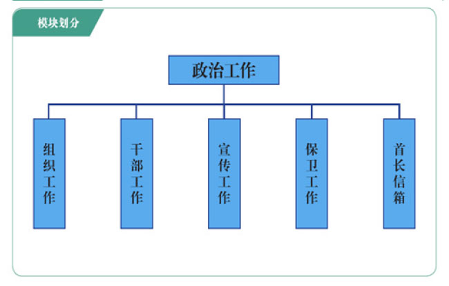 政治工作主要包括组织工作管理、干部工作管理、宣传工作管理、保卫工作管理四个子系统,实现对部队组织工作、干部工作、宣传工作、保卫工作的综合管理,提高政治工作的信息化管理水平。