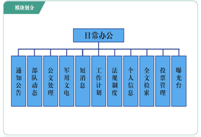 日常办公主要包括公文处理、通知公告、军用文电、工作计划、工作动态、工作备忘、法规制度、个人信息、短消息九个子系统,实现旅团机关、营连部(分队)日常办公处理,提高部队日常的办公效率和信息化水平。