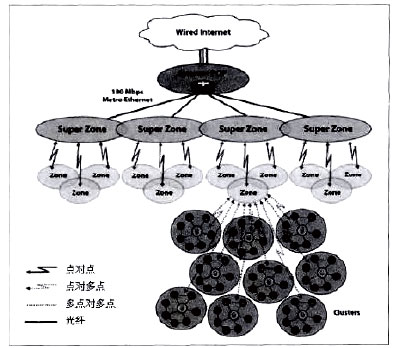 最高层super zone的回程拓扑模式采用的是点对点,即super zone中的AP通过点对点方式与zone中的AP进行通信。这样可以保证每个回程链路工作在最大带宽25-30Mbps,不需要共享,因此时延最小,可以为用户提供高速数据业务和实时性要求高的业务,如语音和视频业务。