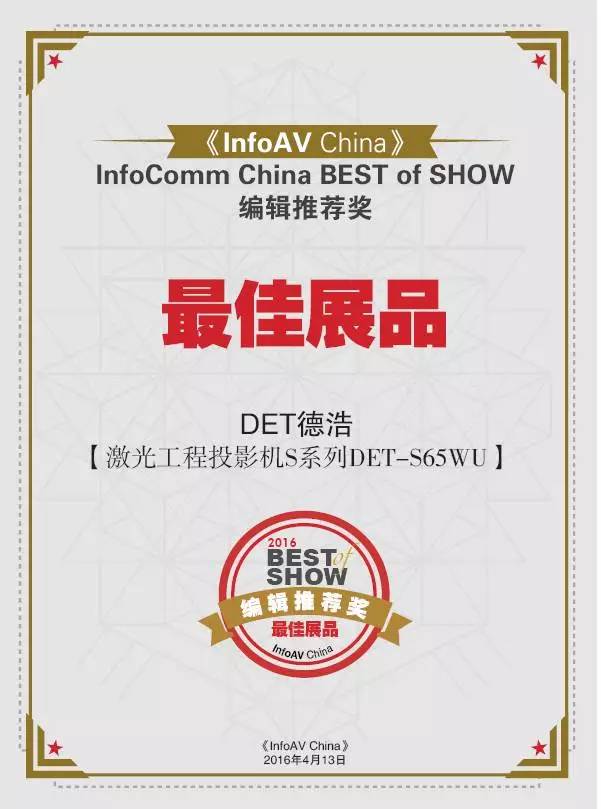 DET激光工程投影机S系列DET-S65WU 荣获《InfoAV China》InfoComm China Best of Show最佳展品奖。