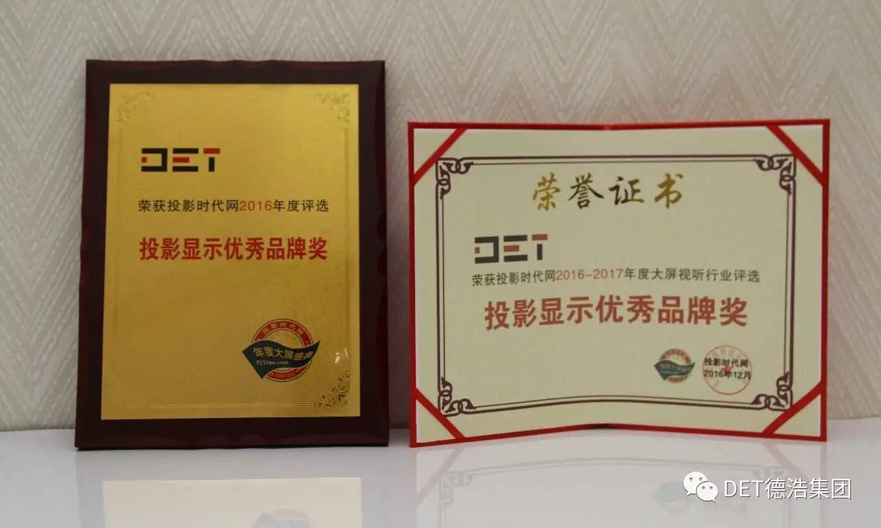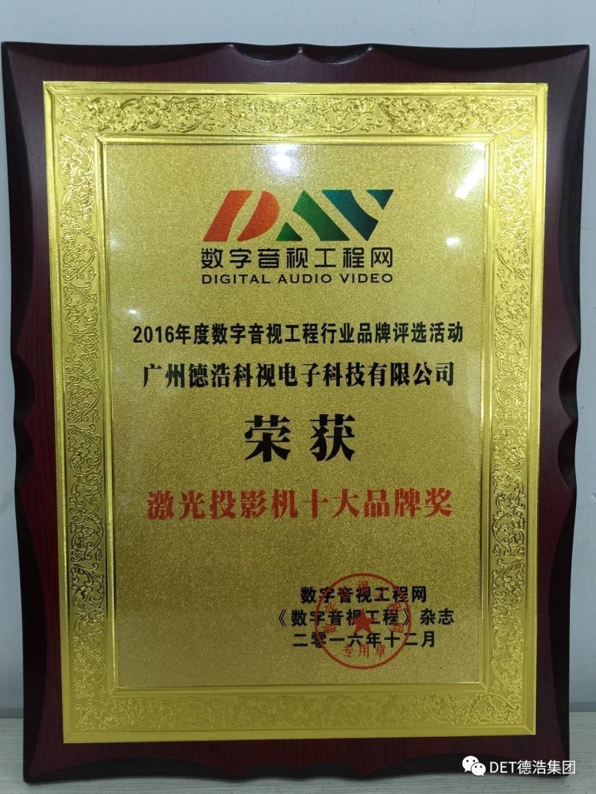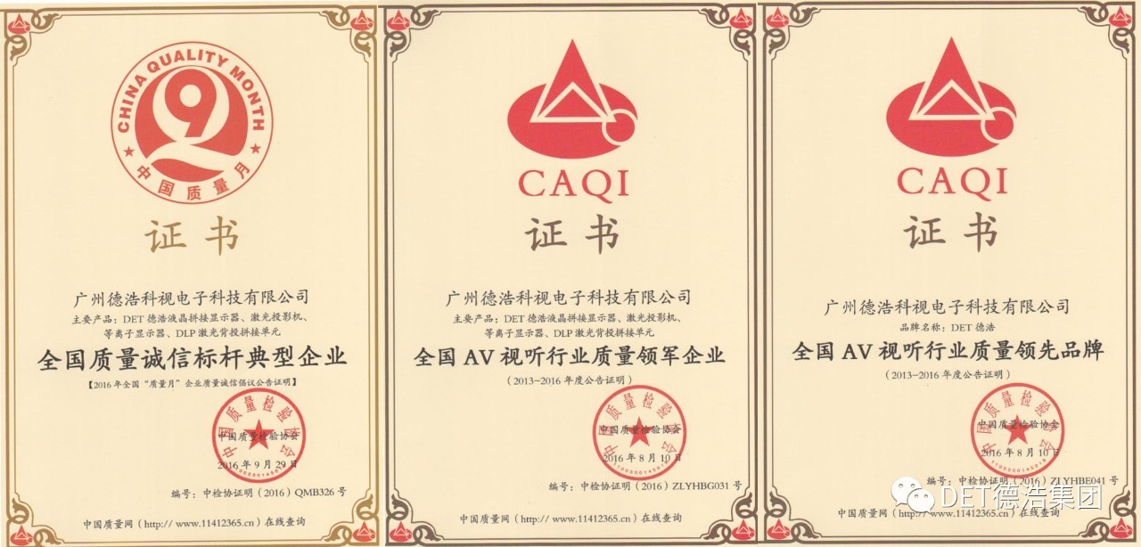 同时,DET德浩在由中国质量检验协会举办的“2016年全国“质量月”企业质量诚信倡议专题活动”中荣获:“全国AV视听行业质量领先品牌、全国AV视听行业质量领军企业、全国质量诚信标杆典型企业”荣誉称号。