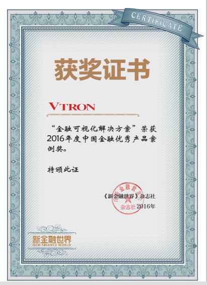 近日,在《新金融世界》举办的2016年度中国优秀金融信息化、金融创新成功案例评选中,"VTRON金融可视化解决方案"荣获2016年度中国金融优秀产品案例奖。