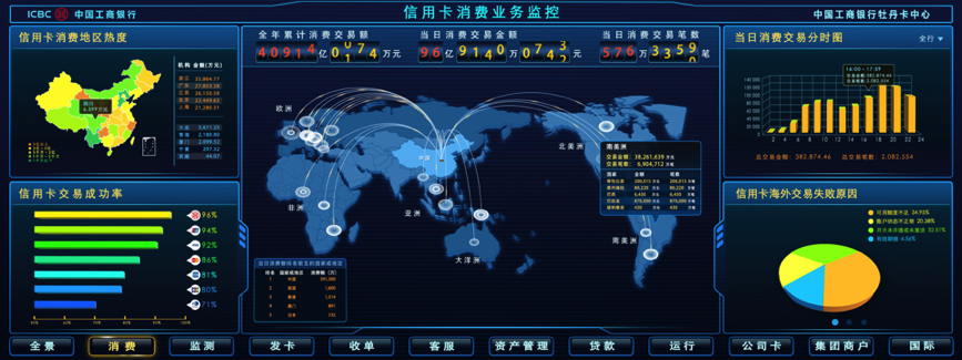 Vtron 金融可视化解决方案依据对信用卡业务的理解,运用高分辨率数据可视化技术手段,实现了信用卡发卡业务、收单业务、消费业务、资产质量、风险监控、集团商户、清算业务、境内外全景业务、客户服务、公务卡业务、贷款业务、舆情资讯等全方面的监控。方案通过丰富灵活的图表转换,配置相应声效、色彩、动态效果,进行大屏幕展现预警处置,可为各类机构、各层级经营和管理人员提供直观、丰富、可干预的业务数据展示和监控平台服务,从而达成“信用卡全业务流程”监控的目标。