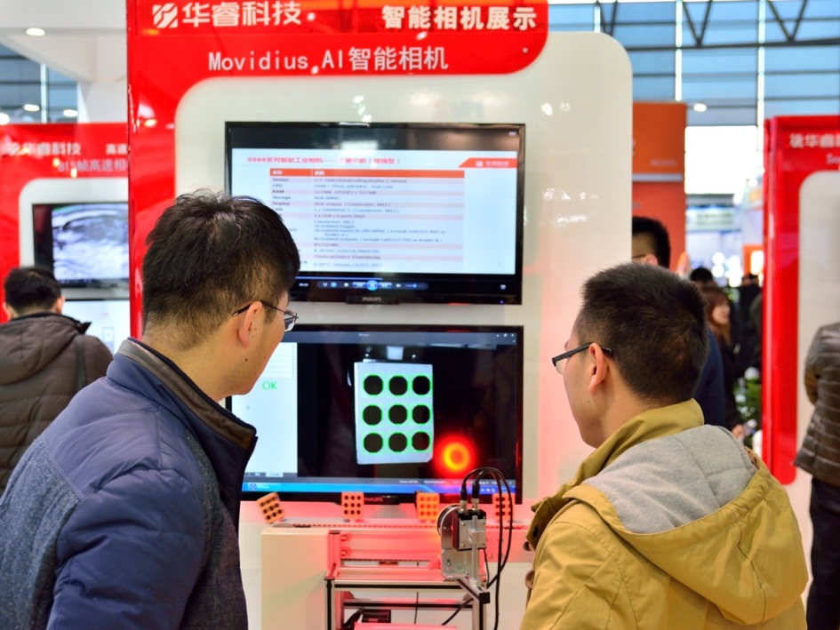 除大面阵工业相机外,华睿科技还与美国Movidius联合发布全球首款Myriad 2平台智能工业相机。同时发布的7000系列面阵工业相机,采用SONY最新一代IMX系列全局曝光CMOS传感器,高度契合了行业级产品的需求,具有超强的适应性,获得了行业领导、嘉宾、客户及媒体的高度关注和追捧。