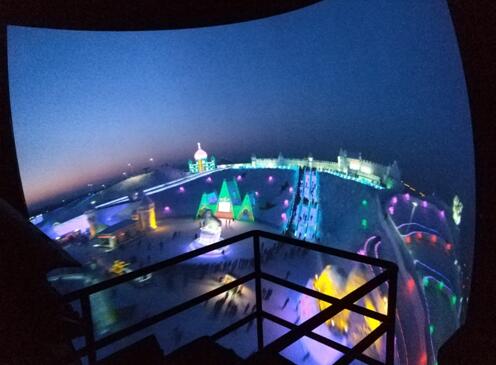 “飞越龙江”是世界一流的超大球幕动感影院,球幕直径20米,高度为15.8米,由二十余台科视 Roadster HD20K-J投影机投影,完美的沉浸感,带领游客纵览哈尔滨壮美风光。