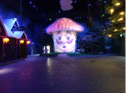 电影乐园入口,中庭的“大蘑菇”创意投影吸引眼球,萌萌的造型,可爱的卡通形象投影,这样的异形投影最考验的就是技术设计和调试功底,科视投影机和7thSense无损媒体播放器的搭配完美地解决这一难题。
