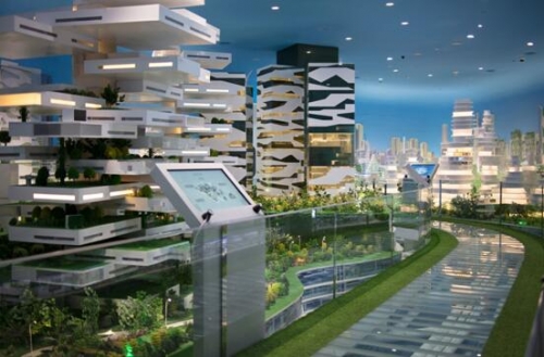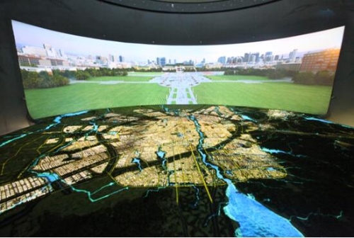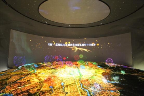 多媒体沙盘厅是一个半球形的立体空间,地面是硕大的智能化大型城市沙盘,周边是双曲面弧形屏,顶上是天幕联动投影。如此复杂、独特的沙盘厅设计上在国内是独一无二的,视觉效果非常震撼。