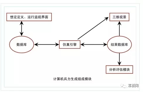 计算机兵力生成部分是JTS作战仿真系统的核心,为整个仿真系统提供虚拟战场环境和仿真实体。包括:想定定义界面、数据库、仿真引擎、想定监视界面、三维视景、结果分析评估等模块。