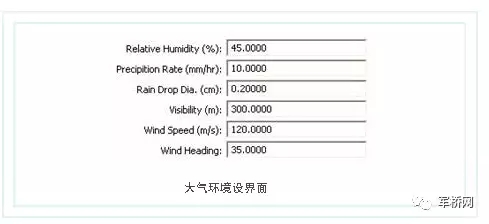 大气:支持标准的大气模型,用户可设置右图所示的环境参数。同时用户还可通过设置能见度参数、云参数、光照及环境色,模拟晴、阴、多云、雾等多种期望的大气条件,并在各种效果中模拟风向及风速。