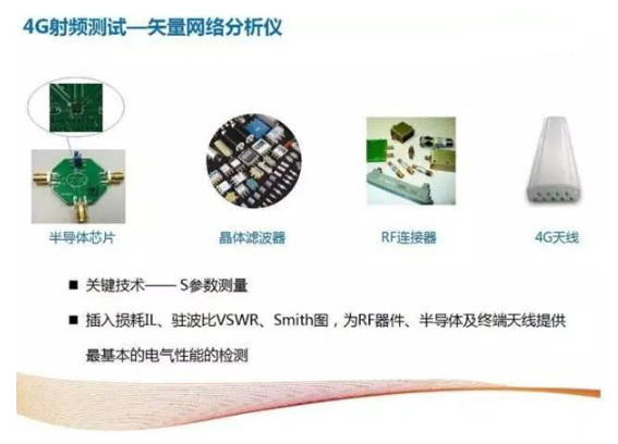 4G时代的射频器件形态多样,有半导体芯片、滤波器、RF连接器以及天线等。矢量网络分析仪也不再局限于S参数的测量,还具备插入损耗IL、驻波比VSWR、Smith图的测量功能,为RF器件、半导体及终端天线提供最基本的性能检测。