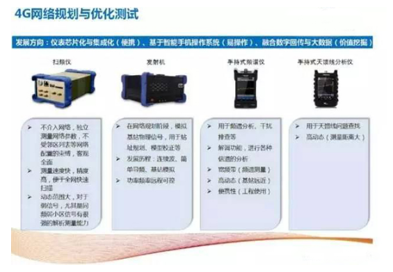 扫频仪具有扫描速度快、灵敏度高、动态范围大和独立于网络进行测试等突出特点;发射机则经历了从发射连续波到发射简单导频再到模拟基站的发展历程,支持远程可控;手持式频谱仪用于频谱分析、干扰排查等,能够解调参数从而进行各种信道的分析,具有宽频带、高动态、便携性等突出优势;手持式天馈线分析仪用于查找天馈线的问题,测量距离大,方便灵活。