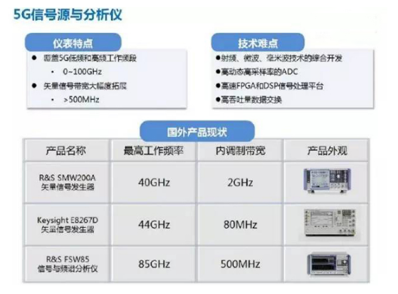 信号源与分析仪仍将是5G时代最重要的通用测量仪器。5G信号源与分析仪,工作频段需要覆盖从低频到微波毫米波的范围,同时支持500MHz甚至数GHz的矢量信号带宽。