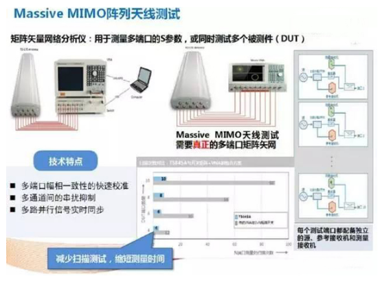 Massive MIMO天线测试需要真正的多端口矩阵矢网。多端口矢网能够同时测试多端口的S参数,有效减少了测量时间;同时,每个测试端口都配备独立的源、参考接收机和测量接收机,可并行测试多个被测件。