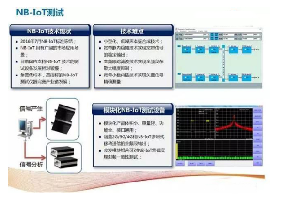 目前国内支持NB-IoT 技术的测试设备相对较少,亟需低成本、高指标的NB-IoT测试仪器完善产业链发展。一些潜在的关键技术将大大加速NB-IoT测试仪器的研发进程,例如:小型化、低噪声的本振合成技术,宽带脉内稳幅技术可用来实现宽带信号的稳定输出,变频跟踪滤波技术可用来实现全频段杂散大幅度抑制,宽带小数内插技术能够实现矢量信号精确测量。