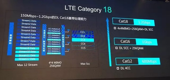 在本次发布会上,华为首先展示了麒麟970的通信能力,突破性的使用了4*4MIMO、5CC CA以及256QAM等多种先进技术,将碎片化的频谱聚合成为最大带宽,聚合峰值能力最高可达到1.2Gbps的下载速率。