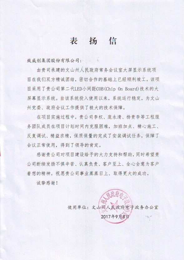 2017年,威创为文山州政府常委会议室建设了COB小间距LED系统。项目建成以来,该系统已服务于州政府多次重大活动、重大会议的举行,其优质的显示效果、系统的稳定可靠获得了客户的一致认可。文山州政府电子政务办公室特地给威创发来表扬信:“自该系统投入使用以来,系统运行稳定,为文山州党委、政府会议工作提供了极大的技术保障。”