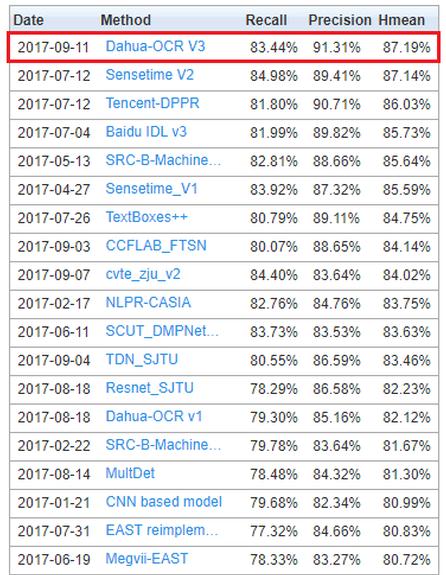 大华股份先进技术研究院,采用深度学习技术研发的文本检测技术,取得了自然场景随手拍文本检测排行榜第一名,标志着大华股份在自然场景文字检测方面取得了突破性进展,为技术成果落地奠定了坚实的基础。