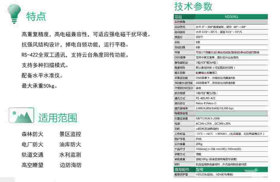 (2)采用野外重载数字云台,具有实时回显位置信息功能,同时配备电动三可变长焦距镜头和低照度高清晰摄像机,可以通过专用操作键盘或监控软件控制云台和镜头;